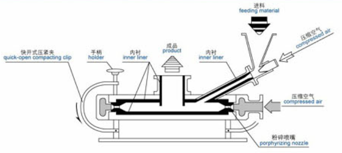 放置于桌面既可以使用,简洁的结构,清理无忧,比较小的投料量1-3克,既可以有较高的收率,设备粉碎性能毫无折扣。 均匀喂料通过均匀进料器向气流粉碎主机给料,并控制进料速度粉碎由连接在给料器上的文丘管吸入粉碎主机内部,粉碎腔压力气体和物料同时进入粉碎机,物料被高速气流粉碎带动,发生高速碰撞,产生粉碎效果。压缩空气伴随成品进入旋风分离器,气固分离气粉混和物高速进入上部圆筒体,粉料因质量大向下旋转运动至下出口质量小向上旋出,气固实现分离尾气过滤进入的气体中夹带少量的粉尘被过滤筒(袋)阻隔。含尘气体被过滤成洁净气体比较后从风机出口排出,气固彻底分离。